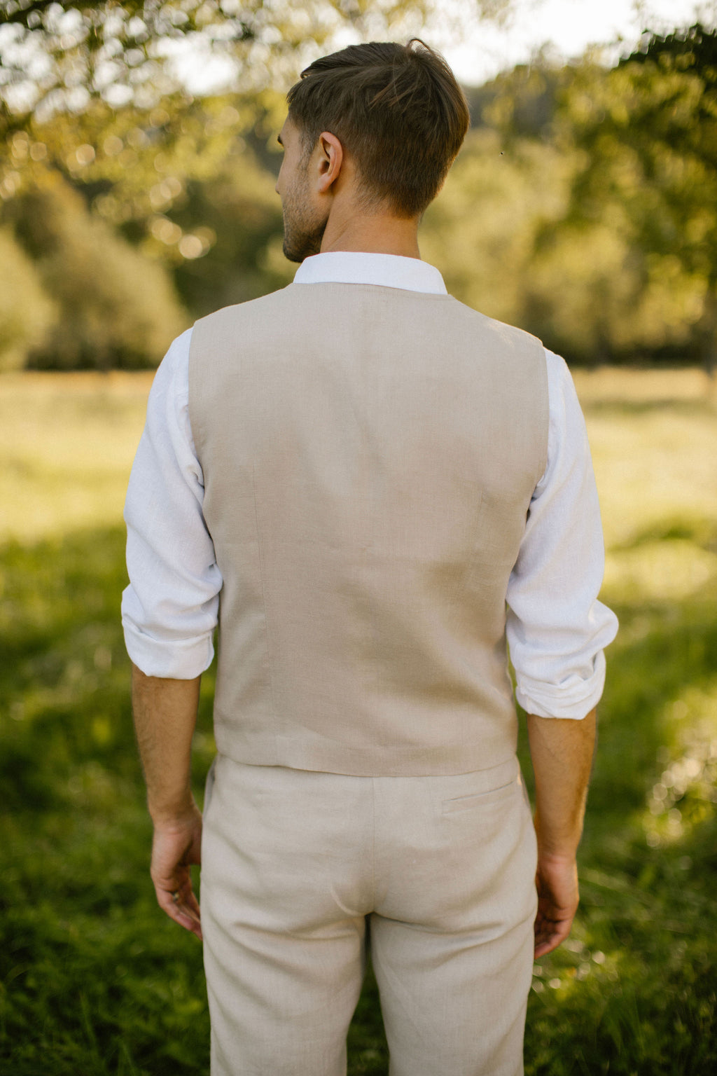 Linen waistcoat for men features button-down front, three pockets, and a double-layered front. The style of this vest combines both ethno-modern and timeless elegance. We chose this design for this product to ensure it remains in your wardrobe for versatile use. Made from 100% softened linen.